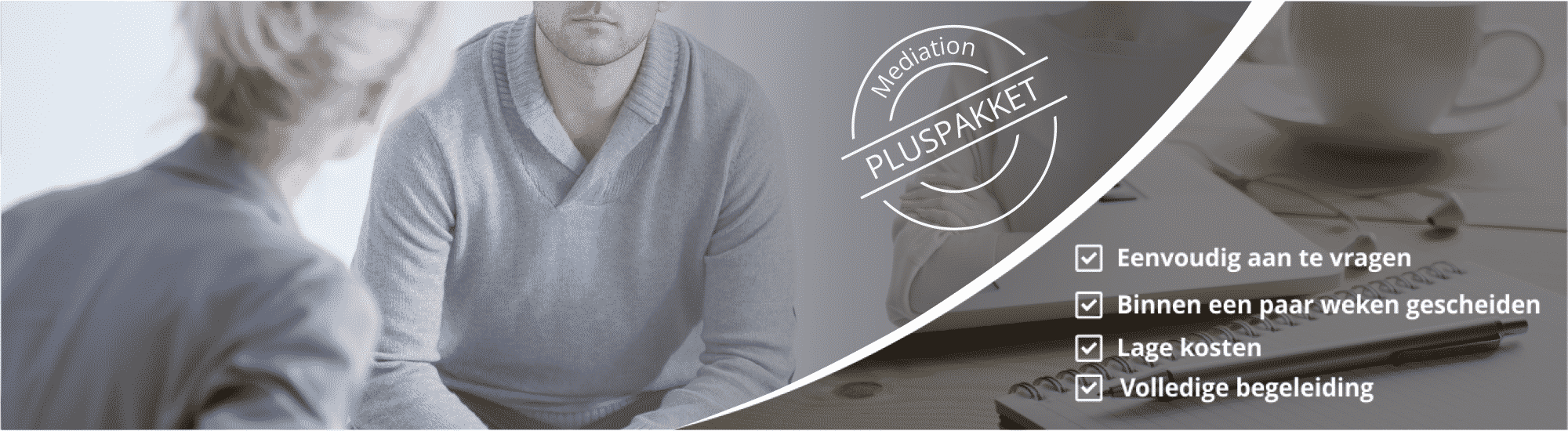 Het Pluspakket mediation is geschikt voor iets complexere situaties waarbij er eventueel sprake is van kinderen, een koophuis of onduidelijkheden rondom financiële onderdelen.